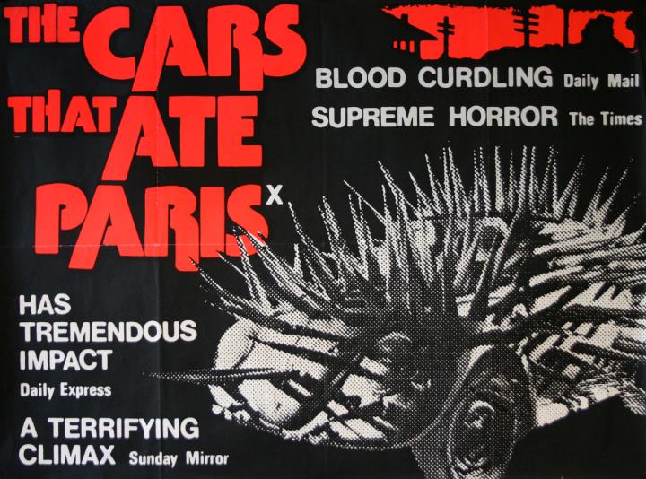 A weird and maybe important film in Australian film history, The Cars That Ate Paris is also one of those films that seems to have been almost entirely impossible to market. There seems to have been a prevailing question amongst distributors, in Australia itself at least, as to who exactly to try and sell it to; to the degree where when it failed for the original distributor, they sold it on to a different one who tried it with another tack. The specifics seeming to be whether it’s a horror film or an art film for marketing purposes. I guess you can’t do both for whatever reason. I’d probably skew more the latter, though frankly the excitingly schlocky title doesn’t really help; you could see something more recently with The Man Who Killed Hitler and then the Bigfoot (2018) which also isn’t quite the film the title, accurate as it may be, appears to be pitching. In the case of The Cars That Ate Paris, while the art and horror elements are present, it’s a lot harder to pigeonhole in general. It’s like a weird mishmash of elements Mad Max (1979), Honky Tonk Freeway (1981) and Britannia Hospital (1982) and a whole lot else besides, but doesn’t have enough of really any of them for it to be comfortable drawing too much of a comparison. That and it predates all three of those I just specifically named anyway.